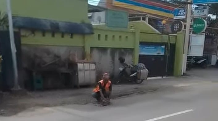 Terlihat dalam rekaman vidio yang di unggah akun media sosial Facebook Azril Fauzan Rasya yang berdurasi 3 detik, ia merekam juru parkir yang sedang meperbaiki jalan yang berlubang dengan pecahan batu dan tanah.