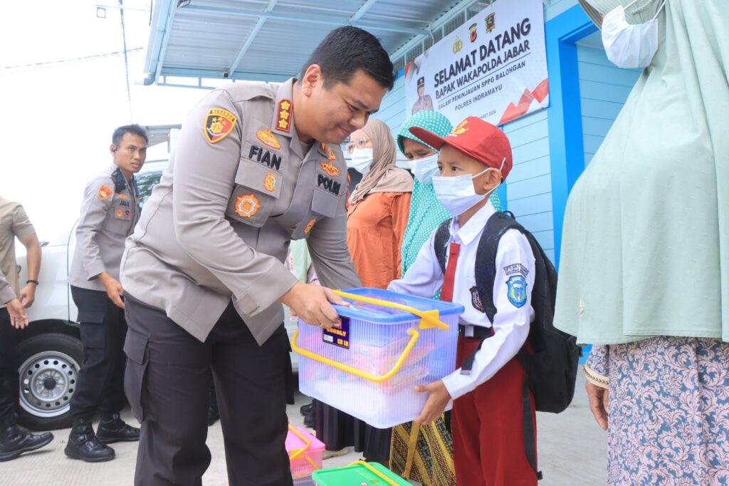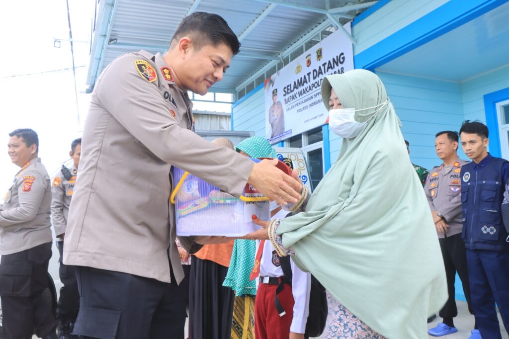 Usai meninjau kesiapan sarana Satuan Pelayanan Pemenuhan Gizi (SPPG) Polri di Desa Sukaurip, Kecamatan Balongan, dan Rutilahu di Desa Krimun Kecamatan Losarang, Wakapolda Jawa Barat Brigjen Pol Adi Vivid Agustiadi Bachtiar, S.I.K., M.Hum., M.S.M., menggelar aksi sosial pembagian paket sembako bagi warga sekitar, Jumat (6/3/2026).