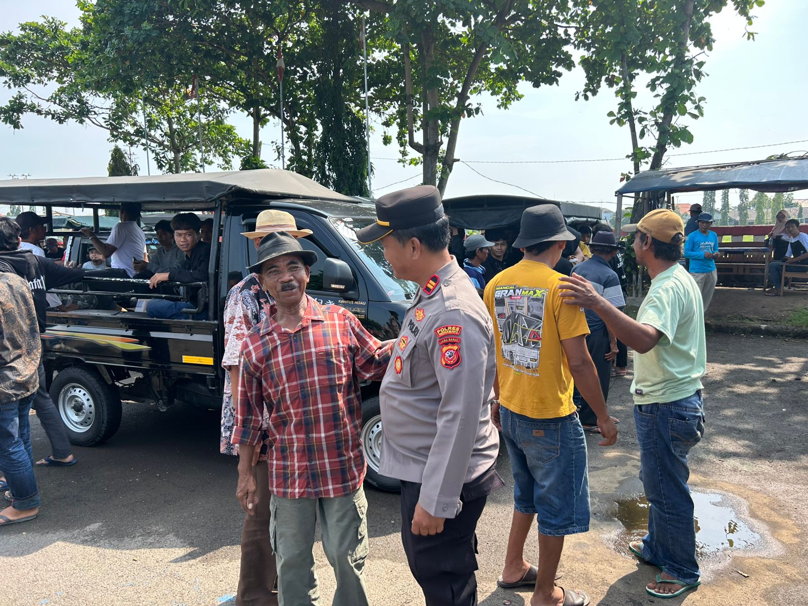 Dipimpin oleh KBO Sat Binmas Polres Indramayu, IPTU Tasim, S.IP., didampingi Kanit Bintibmas Aiptu Asikin, jajaran kepolisian menemui masyarakat yang bersiap melakukan long march menuju Kantor Kejari dan Pendopo Kabupaten Indramayu.